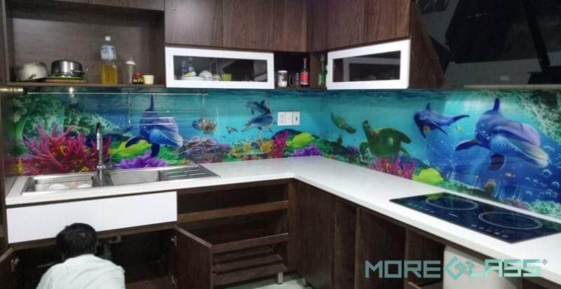 Mẫu thiết kế phòng bếp hiện đại bao gồm tủ bếp gỗ công nghiệp chữ L, mặt bàn đá nhân tạo cao cấp và kính ốp bếp in 3D màu xanh.