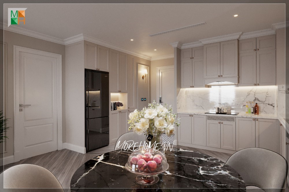 Nội thất phòng bếp đơn giản, với thiết kế thanh ngang là chủ đề chính giúp không gian nội thất trở nên sang trọng và tiện nghi.