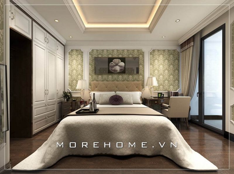 Tủ quần áo gỗ tự nhiên được phun sơn trắng cao cấp và thiết kế âm tường, giúp tiết kiệm diện tích và có thể chứa nhiều đồ hơn.