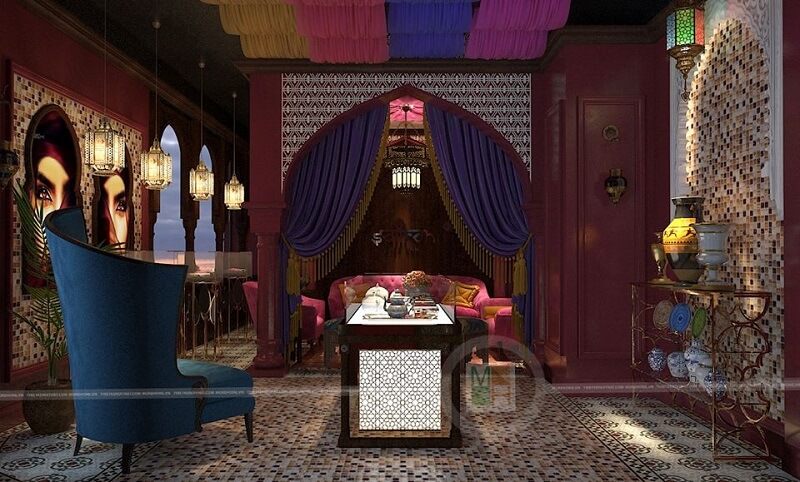 Mẫu thiết kế phòng trà tại showroom Saffron được trang trí với những đồ nội thất có họa tiết nổi bật theo phong cách Iran- Địa Trung Hải.